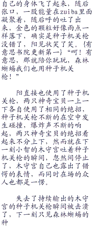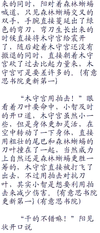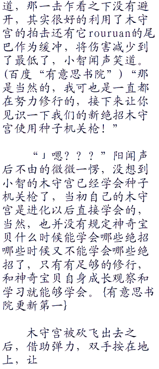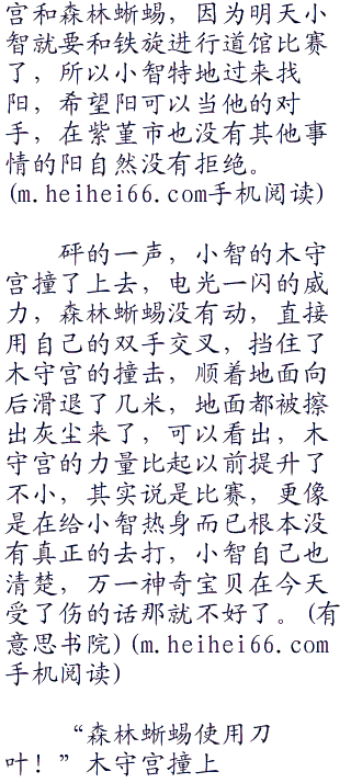 “木守宫使用电光一闪!!”此时神奇宝贝中心后面的比赛场地,场地两边阳和小智分别站在一边,场上是木守