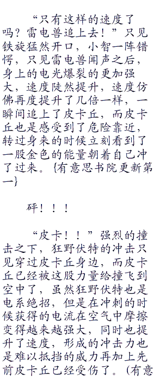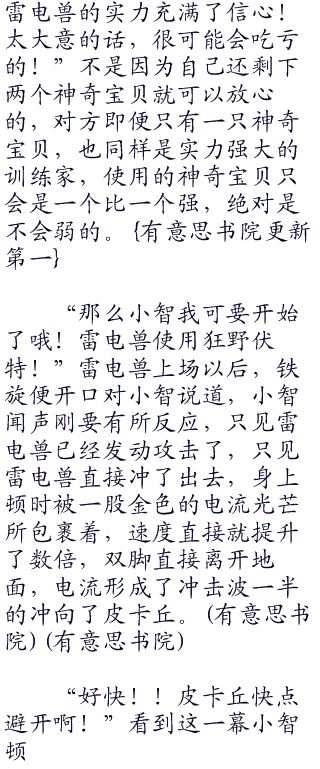 “很好就是这样的斗志,我相信你也已经迫不及待了上吧雷电兽!”看到小智这个样子,铁旋也是很高兴,他很喜欢和这些年轻的训练家们战斗比赛,因为只有和他们交手的时候,自己年迈的热情才会持续不息而铁旋也拿出了自己的第二个神奇宝贝了,眼前熟悉的身影出现在眼前。
