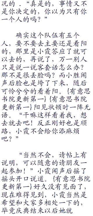 “是啊!我们也刚好从这里经过,对了,我听说小遥你已经接手了华蓝道馆了,怎么现在还会有时间来芳缘地方?”阳闻声后开口说道。倒不是听说只是阳自己知道而已,小霞现在已经接手了华蓝道馆了,理由就是那三个坑爹的华蓝三姐“九三三”妹跑去跑去世界巡回旅游了。