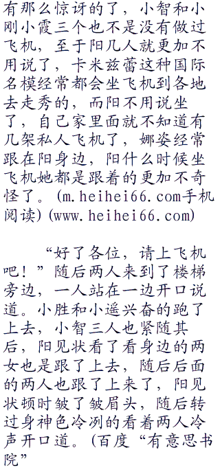 阳却至始至终都没有说话,卡米兹蕾和娜姿也是默契的选择沉默了,于是一行人就跟着两人一起走了,跟着两人来到了机场,从通道中走过来到了一架豪华的飞机下面,对于小遥和小胜来说这么近距离的看着这么豪华的飞机可是很少见的,小胜止不住的兴奋。“哇!我还是第一次这么近距离的看到飞机呢!”