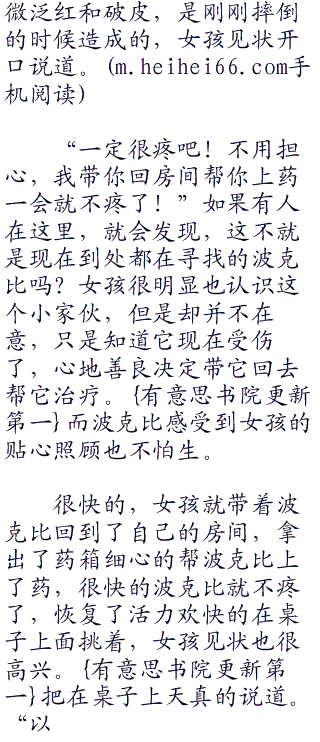 好奇之下女孩走了过去,只见草丛之中,一只神奇宝贝从草丛中走了出来,不小心被草丛绊了一下顿时摔倒在地,头磕到了地上,抬起头来脸上顿时露出了可怜的表情,一双小眼睛也是泛出了泪花,女孩见状连忙上前去将其抱了起来。“你没事吧!疼不疼? ?”