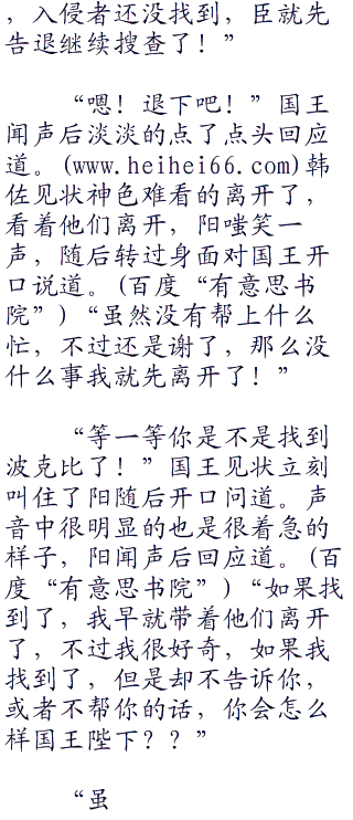 “怎么样摄政大人,收获不小吧!”阳见状刻意的讽刺道。一副我就要玩死你的样子,韩佐见状握紧了拳头,他发誓现在他很想把阳碎尸万段,不过现在还不是时候,只想快点离开这里,不然他怕再看到阳会忍不住。“国王陛下