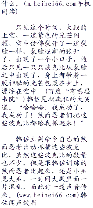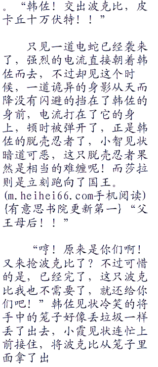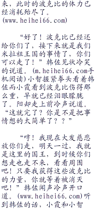 “国王的位置?哈哈哈!你未免把我想的太肤浅了,我要的不单单是国王的位置,我还要借助波克比的力量进入波克比乐园,得到波克比的力量,我要成为无人能及的王,而不是像你一样龟缩在这里!”可以说韩佐的野心确实很大,但是他根本不知道,这么做的后果是