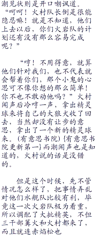 阳离开没多久以后,娜姿等人也来了,看到阳不在顿时露出了警惕的表情,一副要战斗的样子,而火岩队火村自然不会说什么,毕竟刚刚才被阳教训了一顿,现在怎么可能会说什么,而且还是在老对头面前,而另一边的潮大概也猜测的出来这些人是刚刚那个少年的同伴了。