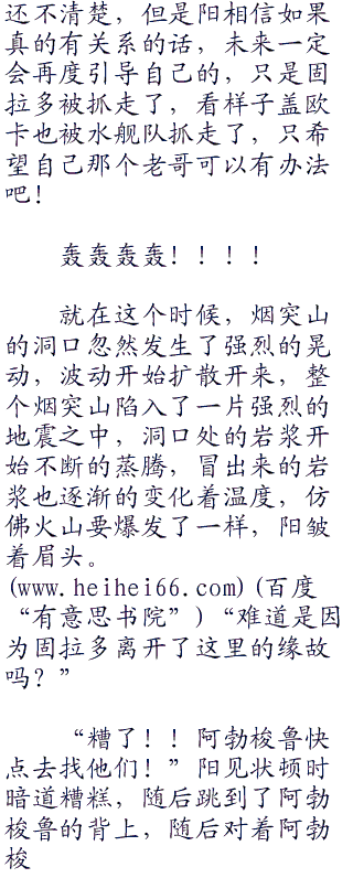 而那个铁链不只有一条,铁笼用来保存固拉多的身体的更加是坚不可摧,这样想要破坏恐怕是没办的,所以渡决定不打草惊蛇,继续卧底在火岩队之中,虽然固拉多让火岩队带走了,但是只要自己还在火岩队里面就还是有机会的,所以渡依旧决定跟火岩队一起离开了,似乎注意到了阳的目光。