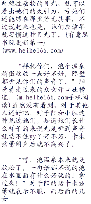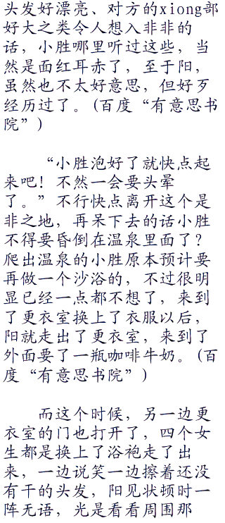 随后就听见耳边传来了一阵让阳和小胜面红耳赤的声音了,呃好吧阳纯粹是因为温泉太热的缘故,小胜才是真正的面红耳刺,因为对面的几个女生,正在相互夸耀对方的身材哪里哪里好,对方的
