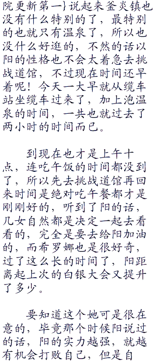 反正时间也还早,先去好好的放松休息一下,晚点再去挑战道馆也无所谓,跟着四个女生的脚步,很快就来到了一家釜炎镇当地的知名温泉旅馆了,进入其中办理了房间值周,四个女生就高兴的去泡温泉了,而阳则是先到神奇宝贝中心了,神奇宝贝中心距离这个旅馆一点也不远,就在隔壁而已,只有一小段路。