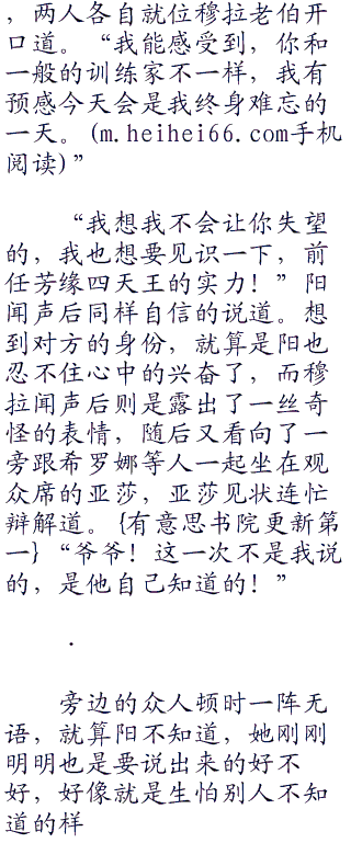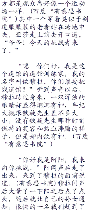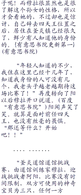 “你爷爷?这么说你爷爷就是道馆训练家咯?”跟着女孩一起走了进去以后,小胜好奇的开口问道。女孩闻声后笑着点了点头。“嗯!我的名字叫做亚莎,我爷爷穆拉就是这家釜炎道馆的道馆训练家,你要来挑战我爷爷可是要做好心理准备的哦,我爷爷的实力可是很强的呢!他可是”