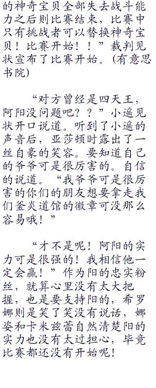 而说到穆拉这个人,来历可不小,曾经是芳缘地方四天王之一的火系天王,年老之后推出了四天王行列之后就居住在釜炎镇,并且成为了道馆训练家,当然所用的神奇宝贝阵容还是当年的阵容,实力可是相当强劲的。所以不用多说,如果是亚莎还好,但是换成穆拉的话,今天的比赛就是一场硬仗了。