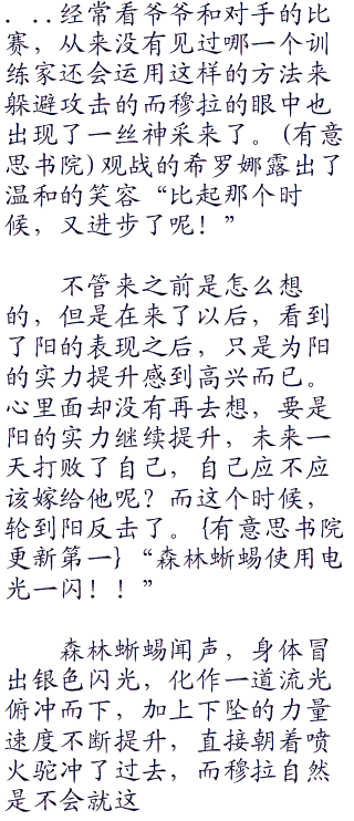 “喷火驼吗?那么我的先队员就是它了,森林蜥蜴看你的了!”阳扔出精灵球,浑身充满生命气息的森林蜥蜴出现在场中了,看到了阳拿出的第一只神奇宝贝之后,现场一片寂静,就连穆拉也是有点意外。小胜更是惊慌的说道。“森森林蜥蜴?为什么?对抗火系的喷火驼还拿出草系的森林蜥蜴呢?”