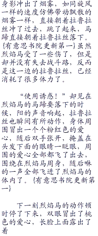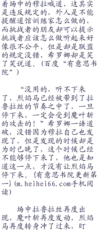 “到底是怎么回事啊?阿阳他现在不是很危险吗??”小胜好奇的开口问道。他不知道什么才算是不是表面,他觉得他自己看的很清楚的了,卡米兹蕾开口道。“看起来现在拉鲁拉丝属于不利,但是其实不一定,仔细看看在拉鲁拉丝使用魔叶斩的时候,烈焰马的突击已经没有一开始凶猛了!”