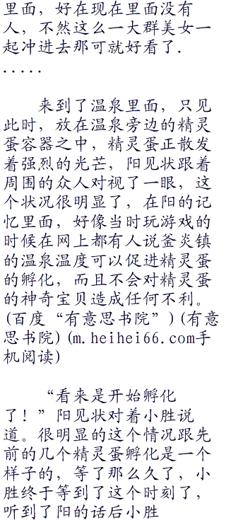 亚莎已经下定决心,要好好的继承道馆训练家的位置了,而这一边众人回到了旅馆以后,因为刚刚进行了比赛别说了参加了比赛的阳了,就算是娜姿等人也是看的浑身都流汗了,所以自然又是免不了好好的泡一泡温泉了,结束了道馆对战以后,终于可以好好的放松一下了!