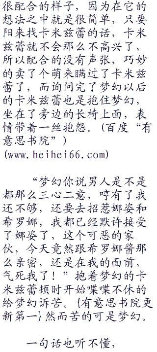 “妙!!”感受之中,耳边响起了一道声音了,听到这熟悉的声音以后,阳心中一喜终于找到了,而此时跟卡米兹蕾在一起的梦幻,也感受到了阳的气息了,它有点疑惑,对于神奇宝贝来说,它只是能够看得出来,卡米兹蕾很不高兴很难过的样子,所以不放心才跟着她的。