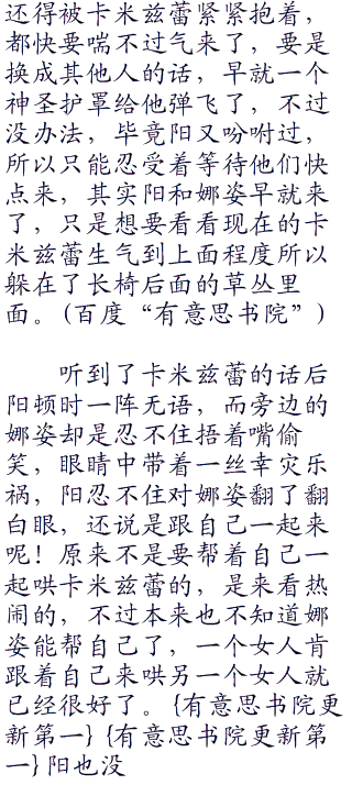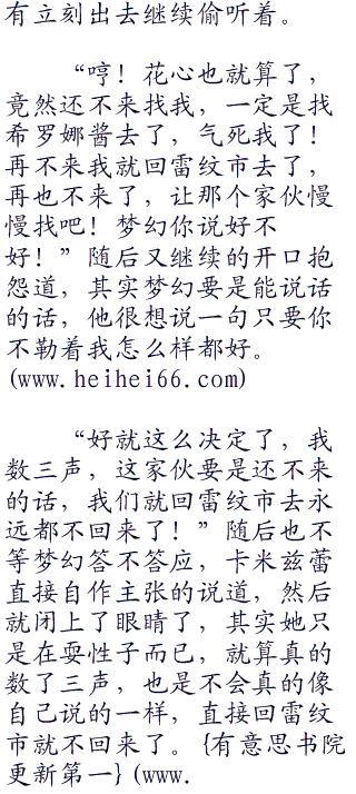 “不知道卡米会跑到哪里去呢!”旅馆外面阳东张西望了一阵随后开口问道。釜炎镇虽然不是什么大城市,但是也不小,直接这样找的话,要是卡米兹蕾有心要躲的话,根本是没办法找到的,这让阳一阵为难,不过很快的好像又想到了什么一样。“对了,梦幻是不是跟着卡米一起走了??”