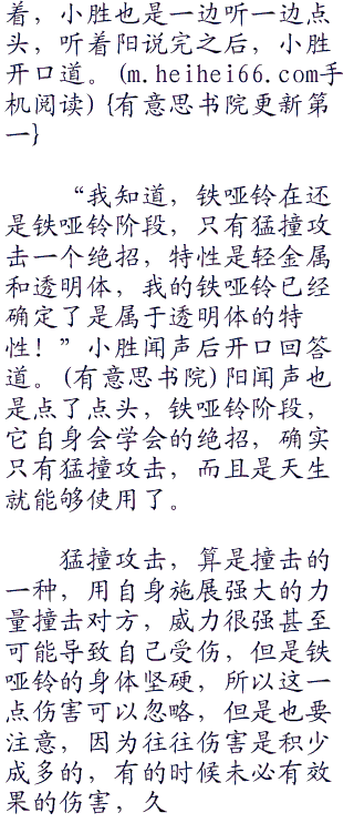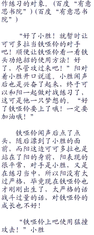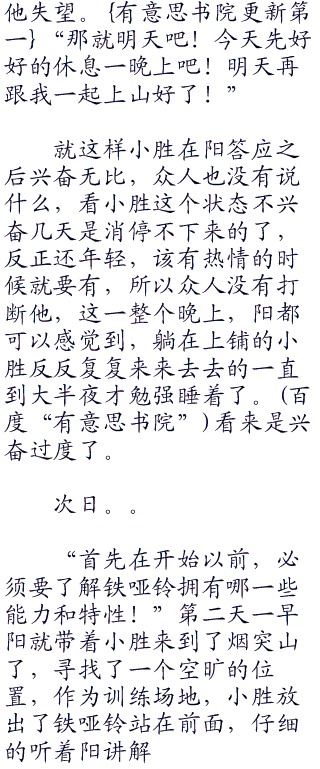 “太好了!铁哑铃要好好努力哦!那我们什么时候开始?”小胜见阳答应以后兴奋的说道。阳想了想看小胜这么兴奋的样子也没有让
