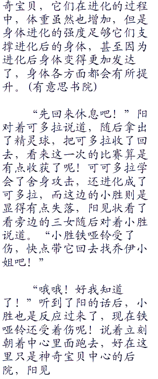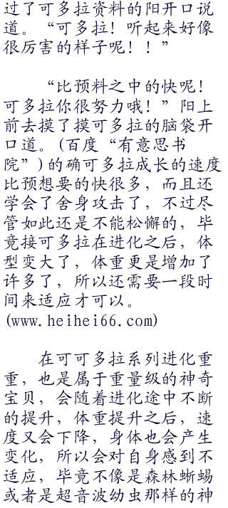 看来自己这几天虽然只是让可可多拉陪着铁哑铃练习,但是却无意之中给可可多拉累积了许多经验了,因为铁哑铃只会使用猛撞,所以可可多拉也只是单纯的和铁哑铃做对撞练习,这样可以增强铁哑铃的冲撞能力,但是没想到的是,无意间可可多拉自身的冲撞力也得到了提升。