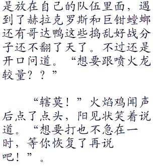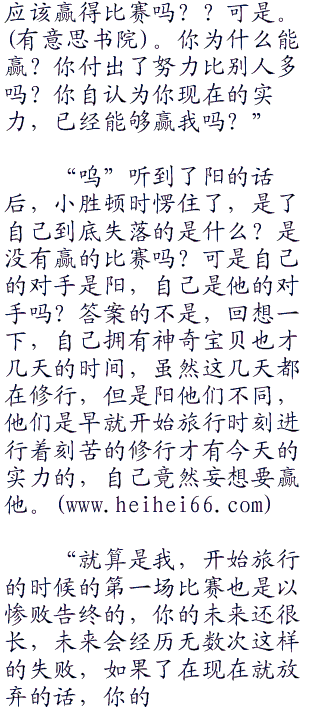 “但是你要清楚,你是为什么而流泪,是因为看着铁哑铃受伤,还是因为没能够赢得比赛?”如果只是因为比赛,那是因为自己的虚荣心作祟,因为这个而流泪没有人会同情,如果是因为铁哑铃受伤,认为自己没有表现好而使铁哑铃的努力白费了,那以后还可以慢慢的补回来。