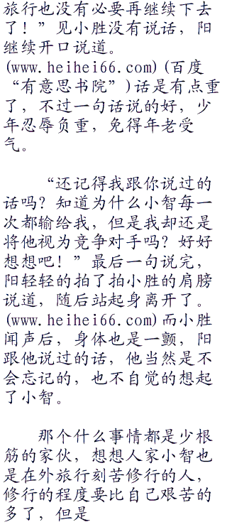 “现在让他受打击,好过以后吃亏来的好!”听着两女的话,阳淡淡的说了一句,随后就加快速度离开了,两女见状对视一眼无奈的摇了摇头。其实她们也是现在,不在其位不谋其职了,换做她们现在是在道馆里面肯定不会说这样的话的,不过现在她们暂时处于休假阶段。