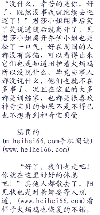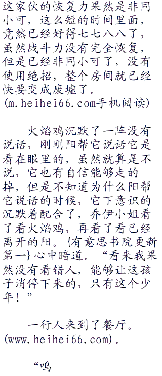 最后又看了看火焰鸡,发现它也没有攻击人的倾向,就向乔伊小姐投去了询问的目光,因为在君莎小姐看来,乔伊小姐是不会骗她的,不过这一次她可是猜错了,乔伊小姐虽然是联盟的人但是并不是那种什么事情都公事公办的顽固呢!“嗯!这孩子先前伤的很重,情绪确实不太稳定!”
