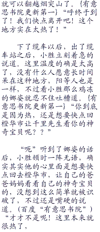 就这样众人告别了爷孙两个离开了,坐上了缆车朝着烟突山另一边前进,到了那边以后,只需要半天的路程,在天黑之前就可以赶到紫堇市了,不需要露宿野外的,搭建了缆车站以后,在这里就显得便捷多了,半小时时间