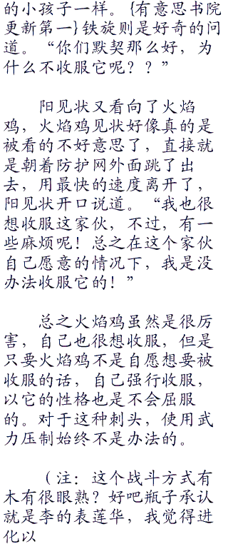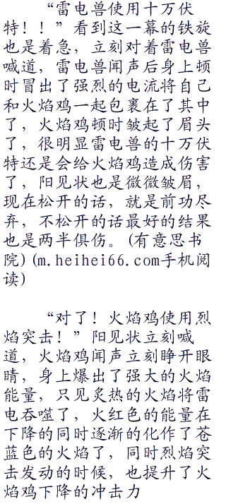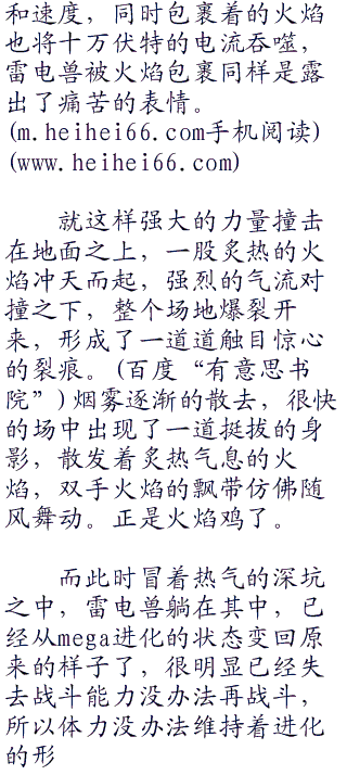 “雷电兽趁现在快点稳定身体!”铁旋见状立刻大喊道。雷电兽闻声努力的在空中保持平衡,等待角落反击的机会,而此时火焰鸡双脚踩在地面再度发力,展现了无与伦比的跳跃力直接跳到了空中,直接追向了雷电兽而去,雷电兽没有反应过来的时候,只见火焰鸡已经带着红色的流光来到了雷电兽的身后了。