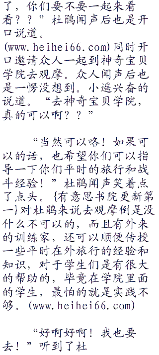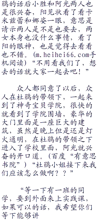 “学生们现在在上自习!今天有人来挑战道馆,我的神奇宝贝受了点伤,我现在是来接它们回去的!”杜鹃是导师倒是也是道馆训练家,所以平时还是要接受道馆比赛的,所以神奇宝贝当然也会在比赛中受伤,受了伤自然也需要乔伊小姐帮忙了,当然作为导师她也是会一些治疗的知识的,但毕竟没有乔伊小姐专业。