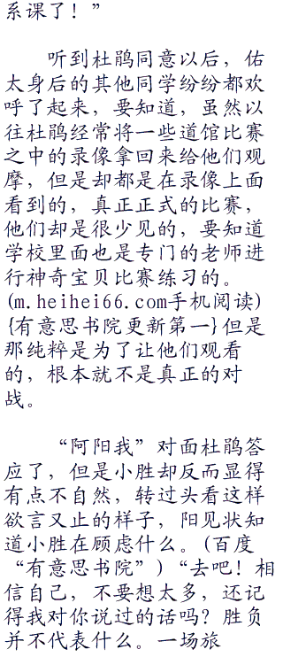 “小胜我看你就答应吧!”而这个时候阳忽然开口对着小胜说道。小胜闻声后顿时一愣,随后惊讶的看着阳,小胜哪里会想到,阳竟然会叫他应战,其实也不是他不敢,只是心中多少也有一些忌惮,毕竟自己的战斗技巧都是阳教的要是自己输了的话,那岂不是给阳丢脸了吗?