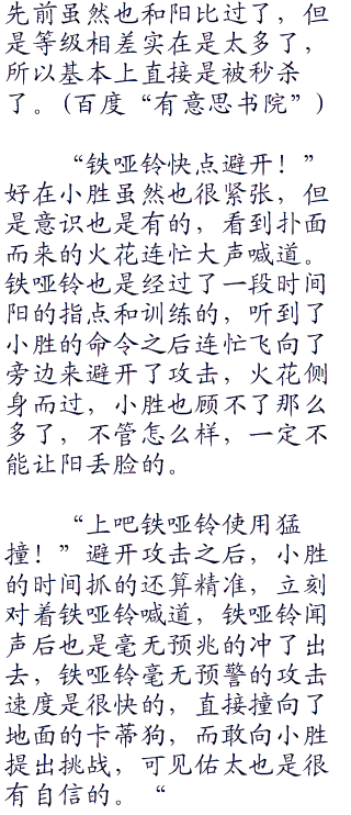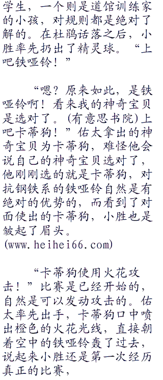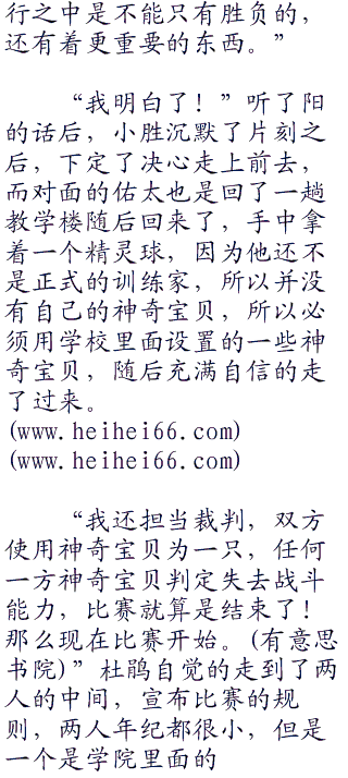 “有神奇宝贝就说明是训练家咯?看你的年纪也我大,我想要看看为什么你就可以成为训练家,我却还要在这里上学,我要跟你比赛!”只见小男孩神色坚定的对着小胜说道。小胜还是第一次被人这样正面的挑战也是微微愣住了,也是有点不自然的样子。“我。。我!!”