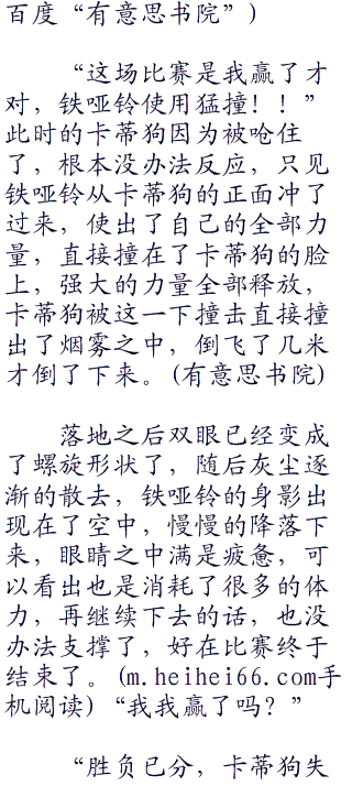 铁哑铃闻声又重灰尘之中冲出来撞在了另外一边的地面上,如此反复之下,别说在别人看来都是无用功,反而是在让铁哑铃消耗体力和自己受伤,毕竟猛撞本身是会受到反作用力的,同时撞击地面也会让铁哑铃受伤,同时消耗自身的体力根本一点用处都没有,观看比赛的卡米兹蕾和娜姿两人这个时候露出了了然的表情。