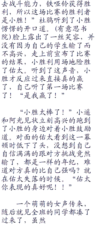 “看来你是放弃了!那就让我来结束比赛吧!”同时跟学生们站在同一边的杜鹃也是露出了赞赏的眼神。心中暗道。没想到这孩子竟然可以想出这样的方式。但是佑太是跟小遥还有阿光一样的,不明白其中的情况,看着小胜的行为,只是觉得小胜已经放弃了比赛在自暴自弃的样子。
