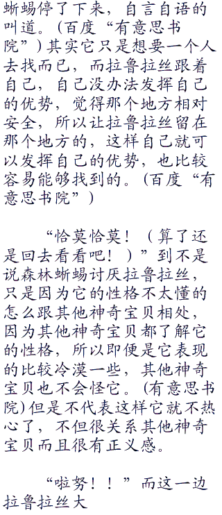 “再找找吧!你们也注意安全!”沉默了一会阳对着它们说道,森林蜥蜴拉鲁拉丝闻声后再度开始寻找了。而想着这样子找也不是办法,想要想一个办法,而这边的拉鲁拉丝和森林蜥蜴离开后,又开始寻找了起来了,森林蜥蜴忽然停了下来对着拉鲁拉丝叫道。“恰莫恰莫(你在这里等一下,我到附近的树上看看 )”