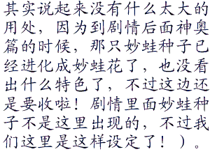 眼前是一只妙蛙种子,在芳缘地方的能够遇到妙蛙种子是很少见的,当然也不是说绝对没有,看它在这个地方,想必对这附近很熟悉了,说不定可以帮助自己找到小胜和阿光也说不定呢!妙蛙种子听了小遥的话后好像在努力的回忆一样,片刻之后好像眼前一亮抬起头对着小遥点了点头。“迦内迦内!”