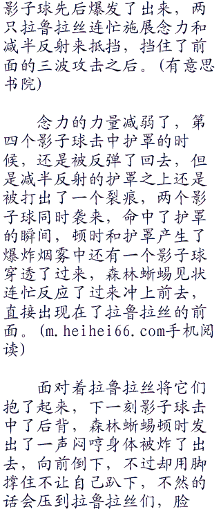 跳到了空中口中同样纷纷聚集着黑暗的能量,这一次的数量比先前还要多,以拉鲁拉丝们的力量是没办法挡住的,影子球爆发出来,好像一个个的黑洞要将它们吞噬一样,危急关头一道绿色的身影划过,拉鲁拉丝们没有反应过来,已经被一股力量带动消失在了原地了,影子球落地之后,顿时产生了强大的爆炸。