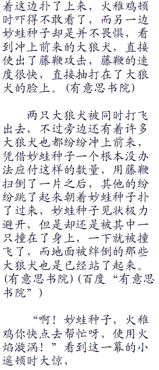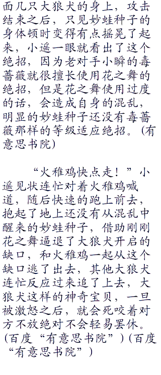 “不要,我不会走的,上吧火稚鸡!”身上的神奇宝贝,伊布还不适合战斗,伊布是很不好培养的神奇宝贝,没办法像可可多拉、铁哑铃这样的神奇宝贝,出生不久就可以战斗了,因为伊布体内基因多变,所以在培养的时候要特别注意,在身上基因没有稳定的情况下最好不要战斗。