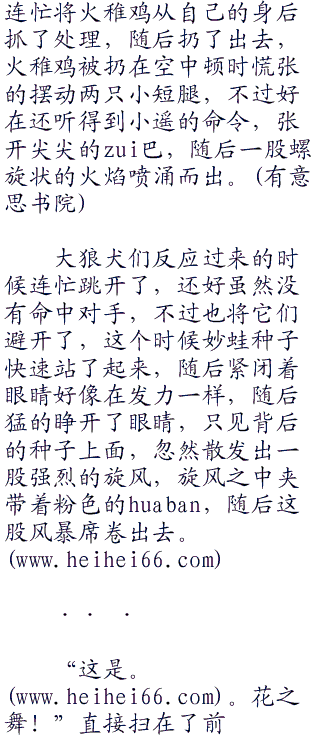 而狩猎凤蝶因为可以飞行,所以被小遥派出去寻找,所以现在可以战斗的就是火稚鸡了,将火稚鸡放出来后还不明白是怎么回事的火稚鸡呆萌的看了看四周,随后看到旁边那么多大狼犬凶神恶煞虎视眈眈的样子,顿时就把火稚鸡吓了一跳,连忙躲到了小遥的身后去,小遥见状顿时一阵尴尬。