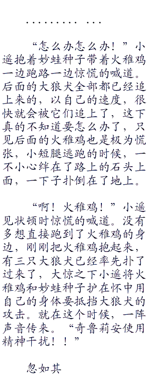 而此时,这边发生了战斗的同时,另一边带着小遥前进的妙蛙种子,这个时候忽然停下了脚步了,随后伸出了自己的藤鞭将小遥抓住了,小遥见状微微一愣,随后想到可能是小胜他们就在这里了立刻好奇的开口道。“妙蛙种子,发生什么事了吗?是不是已经找到小胜他们了?”