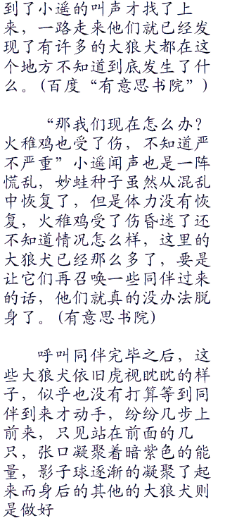 一只跑了很久才甩开了这些大狼犬,但是却发现已经迷路了,完全找不到回去的方向,而且还发现森林里面还有着大批的大狼犬,正在搜寻着什么,使得他们的行动很不方便,一直到不久之前听