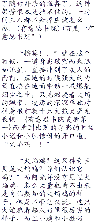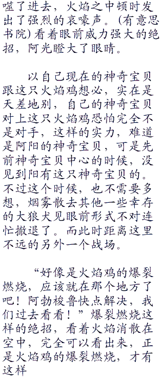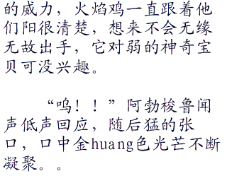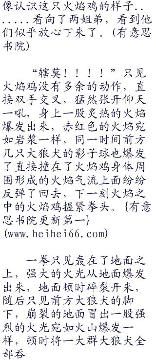 “啊!”小遥闻声后吓了一跳,转过身就看到大狼犬已经扑了过来了,看着那口中仿佛能够闪耀光芒的利齿,小遥心中一阵惊慌。这个时候,小遥怀中火稚鸡直接挣脱了小遥跳了出去,正面迎上了大狼犬,口中聚集一股炙热的能量,化作“五九三”一股橙色的火花直接命中了扑面而来的大狼犬,下一刻。
