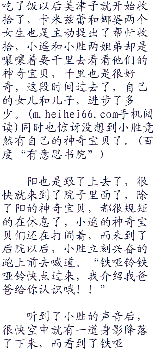 众人来到了院子里面,这个院子里面当时已经来过了,住着千里的所有神奇宝贝,不过现在时间太晚了,大多已经去睡觉了,来到了院子里面的阳将神奇宝贝都放了出来了,娜姿和卡米兹蕾包括小遥跟小胜也是一样都把自己的神奇宝贝放了出来了,然后将准备的神奇宝贝食物都分给了大家了。