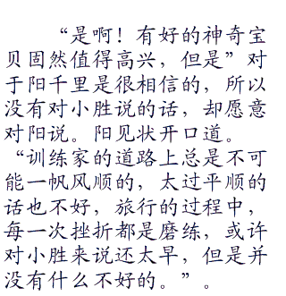 “好了!大家吃完了以后,好好休息不要乱跑也不要吵闹,这几天我们就要准备挑战道馆了,注意保留自己的体力哦!”看着吃着饭的神奇宝贝们,阳开口对着它们说道。来到这里最重要的就是挑战道馆了,所以要保持最佳状态才可以。娜姿和卡米兹蕾两女看了看阳,好像觉得阳跟平时不太一样。