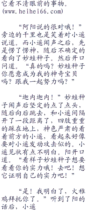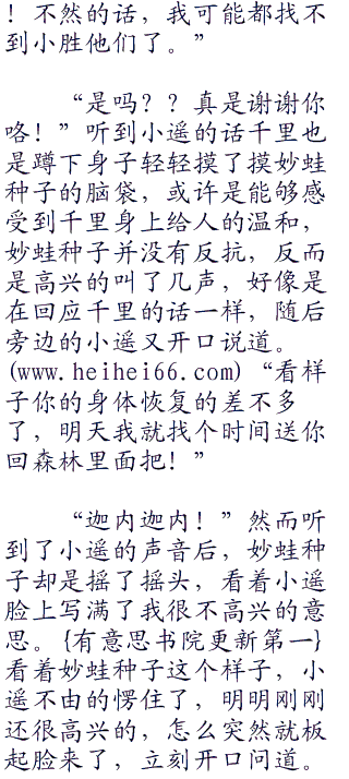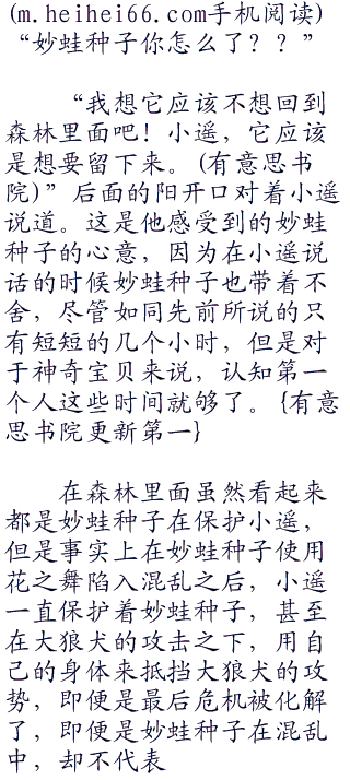 “妙蛙种子你没事了吧!”而这一边的小遥,此时站在中间的神奇宝贝旁边了,蹲下身子来看着妙蛙种子关心的问道。妙蛙种子闻声后眯着眼睛欢快的叫道。表示自己没有什么事,其实本来就没有什么太大的问题,纯粹是还没办法完全适应花之舞,所以混乱的时间有点长而已。