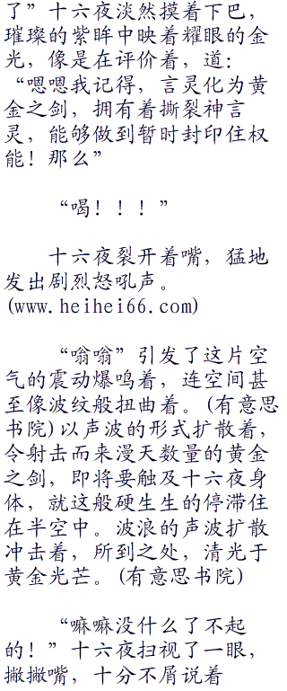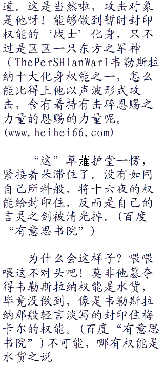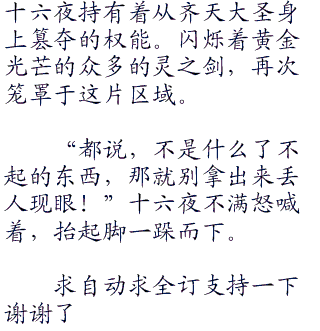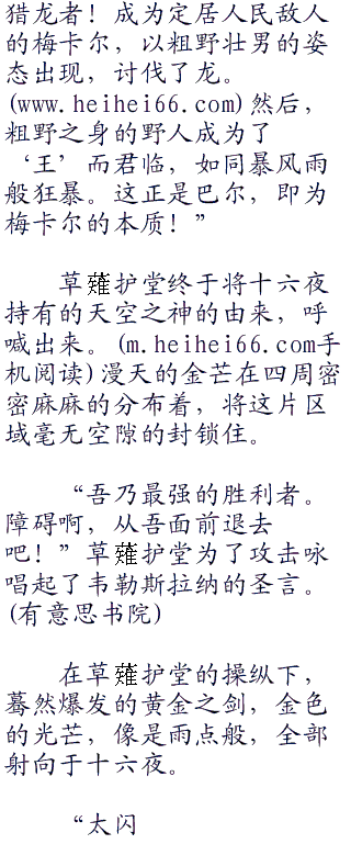 “哈哈哈”十六夜哈哈大笑着,随意地扫视着对准于他的如此数量的黄金之剑,不为所动,好像这些对准的不是他般。微微歪着头,嘴角勾起一道弧线,似笑非笑着,满满嘲讽着道:“草薙护堂,你不是自称和平主义者吗?那为什么会知道关于梅卡尔的知识呢?不是早就想要跟我决斗,专门找出来得吗?不然呢”这点东西,不用思考,便能够看得透彻。