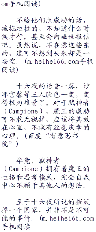 “哦呵无法打开幽世的通道,你是在耍我,是吗?”十六夜扬起嘴角来,浮现似笑非笑地笑容,璀璨的星眸中迸射出危险的目光,扫视着清秋院惠那一眼后,残于的余光顺势瞥了九法冢干彦一眼。