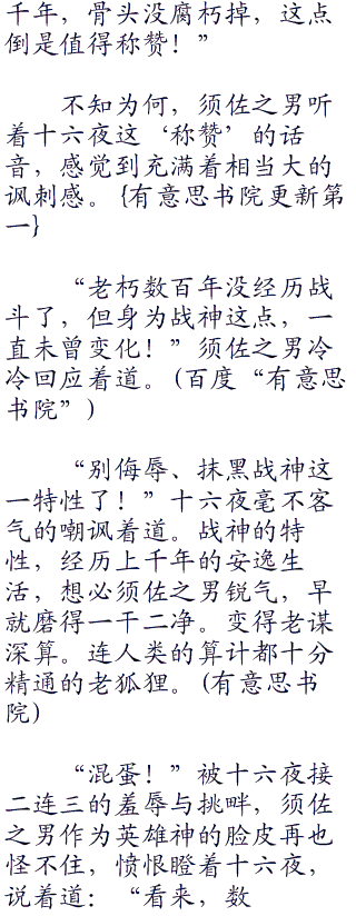 “教训我,别说大话了,区区一只像个耗子躲在幽世上的老不死,也敢在我面前指手画脚!未免太托大了吧,须佐之男!”闻言,十六夜感到一丝好笑,裂开嘴似笑非笑地瞥视着须佐之男,却是用着嘲讽地语气说着道:“忘记跟你说了,敢于抢走我胜利果实的你,也是我此次来得目标!”