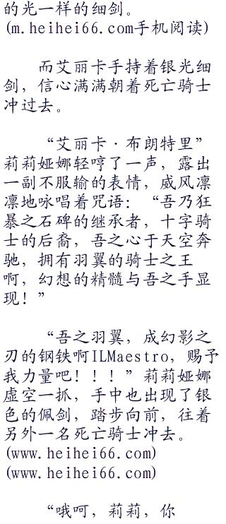 “倾听骑士艾丽卡·布朗特里的起誓吧!我是猛角笛的继承者,黑色的武士的后裔,我心不屈服,我剑则决不折断。狮子心王啊,斗争的精髓现在显现于我手,决斗的时间到了莱恩哈特(CuorediLeone)!”钢铁狮子头张开巨额,而艾丽卡猛地将手伸进钢铁狮子头的口中,拔出一柄银色,就像是一道澄澈