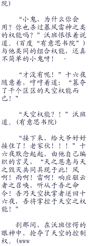 弑杀风伯、雨师和雷公三神而获得的支配着风雨雷电的权能,混合型利用,能够实现国家级的天气操纵。在上百多年前,沃班曾用这个强力的权能,毁灭掉一个大型的港口城市。