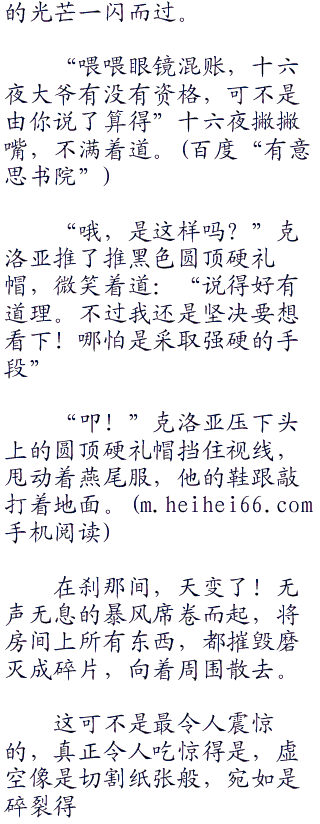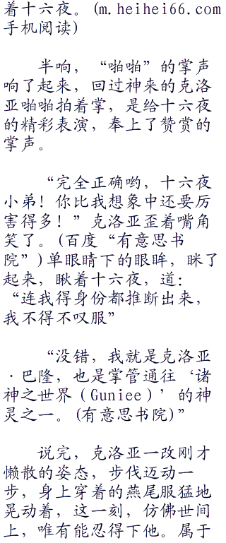 十六夜眯着璀璨的星眸,扫视了克洛亚一眼后,凝视着他单眼睛下的眼瞳,伸~出手指,直指着他,傲然抬起头来,缓缓着道:“而你,就是入口!我说的没错吧?站在生与死、人界与神界交会上的‘永远的十字路口’上,身穿着燕尾服的死神‘十字架男爵(RaronCroix)’!”