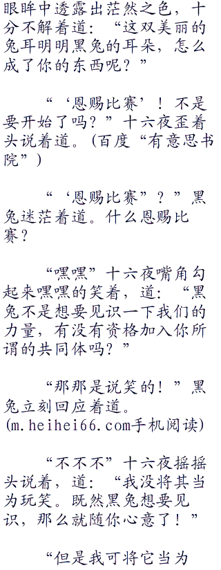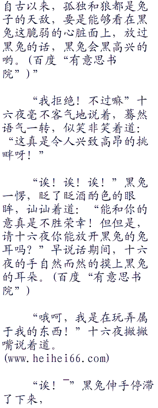 “啊我”黑兔一怔,惊慌不知所措着。这下一时间,该不知如何是好,是安抚呢?还是继续挑畔呢?难以决定该用什么样的方式对待。