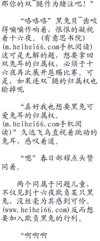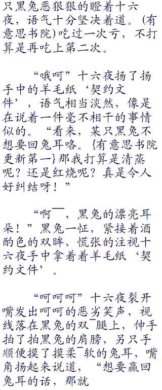 黑兔心中猛地颤动,抬起头来,用美丽的酒酌色双眸透露出希翼的眼神,可怜兮兮的紧盯着十六夜。