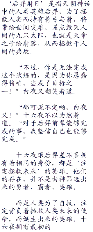 “天上的九只乌鸦,九个太阳,好烦人!”久远飞鸟抬起手,放在狂流着汗水的额头间,挡住了倾斜而落下的炽热的阳光,一脸烦闷得说着道。